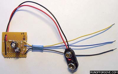 I decided to build an off-board voltage divider with three leads: +9 volts, 4.5 volts, and ground (earth). I also included power supply filtering and reverse polarity protection. This little unit removes 6 components from the breadboard and replaces them with three wires that are much easier to place within a complicated circuit.