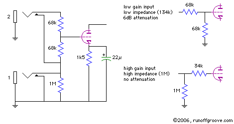 If a JFET with small |Vp| is used and clipping with guitar volume at maximum is not desired, a resistive attenuator might be added. This is implemented by replacing the 1Mohm input resistor with a 1Mohm LEVEL pot or trimpot. In order to avoid affecting the high frequency cutoff, the 33k input resistor and 220 pF filter cap are moved ahead of the trimpot. In this case a slight attenuation (0.28 dB) will be introduced when the LEVEL pot is dimed.