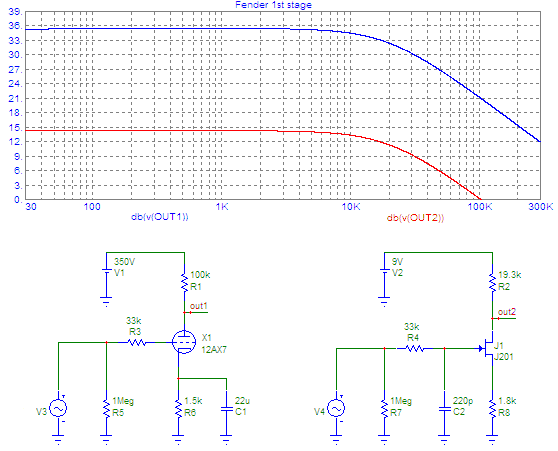 Fig.4 shows the simulated frequency response of the valve circuit when driven by a low impedance source, and a modified JFET stage that has a similar high frequency response. In both cases the -3 dB knee is located close to 20 kHz.