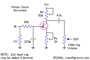 Another area open for modification is adding a cap in parallel with Rs. If a very large cap is added, the overall stage gain will increase by 6 dB, the clipping-free input range will be reduced by a similar amount, and the harmonics will be closer to the original Fetzer Valve, e.g. mostly 2nd order. A more interesting mod consists of adding a smaller cap instead, chosen to add brightness to the sound.