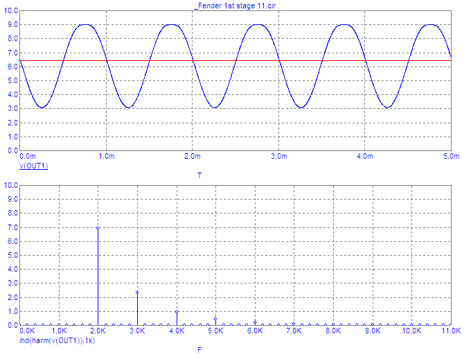 Fig.7 shows the simulated waveform and harmonic distortion obtained for the Fetzer Valve using the component values from the above example. The red line shows the drain bias voltage when the input is zero.