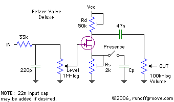 Example: if using a J201 with the average Vp and Idss shown in the next section and Rs= 1076 ohms, then a suitable Presence capacitor would be Cp = 1 / (2*pi*1076*1000) = 147 nF, thus, 150 nF, 120 nF or 180 nF would do fine.