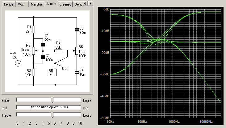 In this "next generation" version named Ginger, the tonestack impedance has been scaled down 10x to reduce noise and overall frequency response has been further adjusted to cover a more suitable range with reduced insertion loss, as seen in this graph from Duncan's Tonestack Calculator.