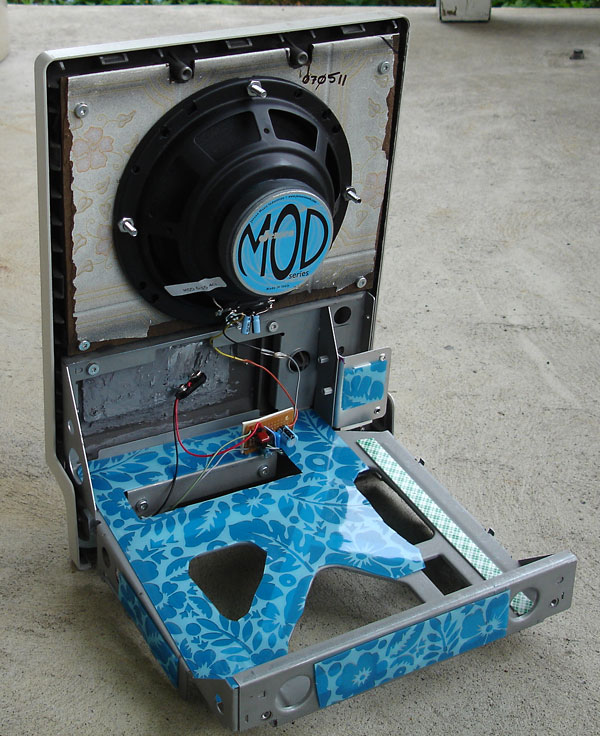 I constructed a baffle with Masonite hardboard left over from a previous cabinet construction attempt and painted the front flat black. After I attached the baffle board and speaker to the front case, I slid the back case on to test the sound. The metal frame was resonating at certain frequencies and I knew that it would need dampening. I used a vinyl placemat and affixed it to the frame with double-sided foam tape, which deadened the vibrations.