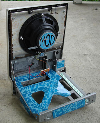 The resulting amp sounds terrific and has a nice form, while retaining the sentimental novelty that led me to originally save the computer. I have yet to wire the DC jack and I may make the offboard wiring modular so I can try out other chip amps, but for now I'm very happy with the success of the project. I'm currently powering the MacRuby with 8 AA batteries, but have been considering the use of a gel cell.